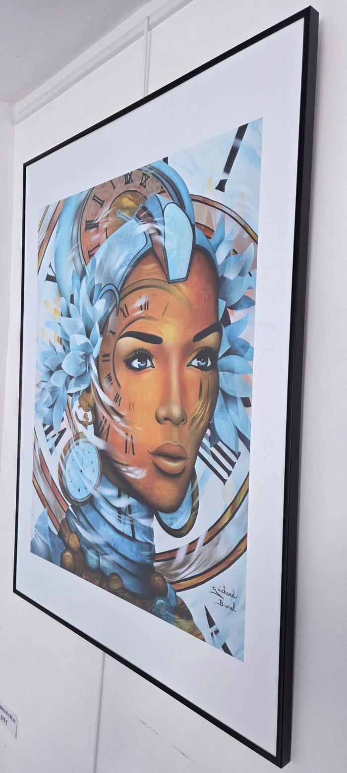 Le portrait central met en scène une femme au regard intense et confiant, dont la peau est teintée de nuances chaudes et dorées. Elle est coiffée d’un turban et parée d’éléments floraux bleu ciel, créant un contraste saisissant avec son teint.